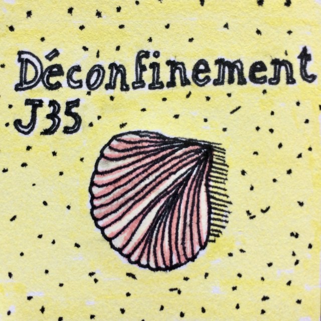 On a grimpé la dune raide qui est la dernière étape avant la mer; arrivés en haut, on a poussé des ah et des oh devant la beauté et l’immensité du paysage étalé. Même parents, on garde un peu de liberté par moments: j’ai couru couru couru pour descendre la dune jusqu’aux petites lagunes. Ambroise derrière essayait tant bien que mal de protéger Céleste du vent mais elle ne lui tenait pas rancune des bourrasques ensablées, toute excitée qu’elle était par la découverte de nouveaux éléments. Un autre indice qu’on est devenu parent: l’omniprésente crème solaire indice cinquante. Ambroise et ma mère se sont chargés de la pénible tâche du crémage de l’enfant tandis que j’allais m’extasier sur les coquillages. C’était marée basse et des micro lacs s’étaient formés sur la plage. L’eau était bleu turquoise comme celle des mers du Sud; je ne sais pas si c’est dû au confinement mais ça m’a semblé jamais vu sur cette plage que j’ai connue étant enfant. J’ai vu des coquilles d’escargot de mer et d’oursin – on appelle ça des tests, apparemment, et peut-être que c’en était un.