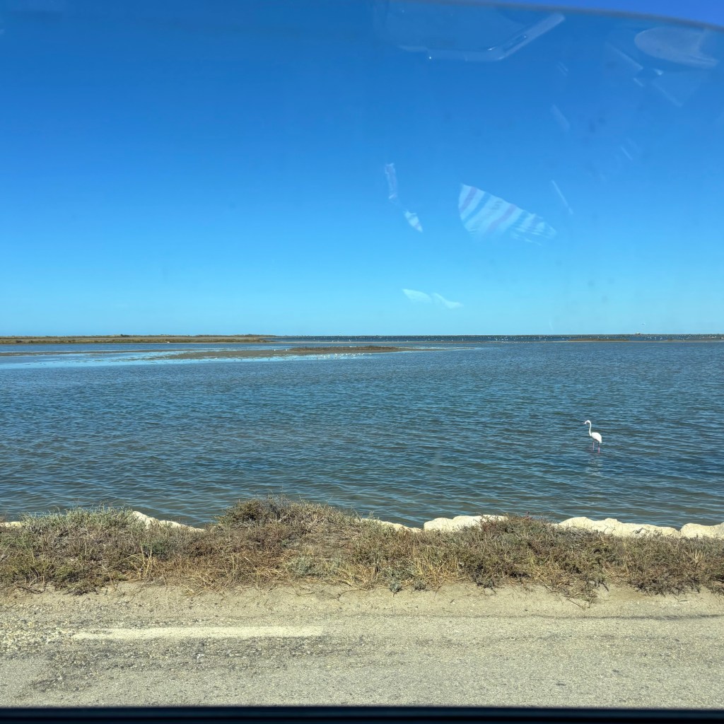 On est partis pour Arles. Après les grands tas de sel et les salins rose irisé, les flamants roses étaient toujours là, en train de brouter sous l’eau. On a dit aux enfants que c’était le seul endroit en France où on en trouvait et ils ont répondu “Non, au zoo!”. Mon cœur s’est brisé un petit peu et j’ai fait le voeu de les emmener moins au zoo et plus en Camargue. Sur la route, j’ai écrit à ma tante Nathalie qui connaît bien la ville: “On va à Arles, tu as des conseils?”.