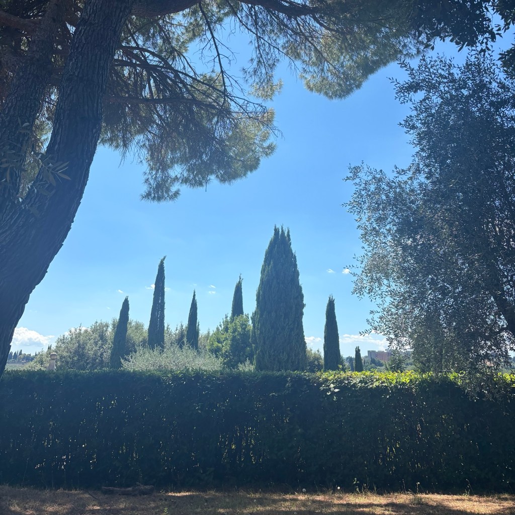 La maison des copains italiens fait partie d’une propriété familiale qui a été divisée en un hôtel-restaurant, et de nombreux appartements. Plus loin sur le terrain, il y a une piscine. Pour y arriver, on traverse des champs d’oliviers. Les enfants d’ici nous ont guidés, faisant la course sur leurs VTT. Je persiste à ne pas aimer les piscines, mais dans ce cas précis, les cyprès, les dalles chaudes en terre cuite et la vue idyllique sur la campagne toscane œuvrent pour son charme.