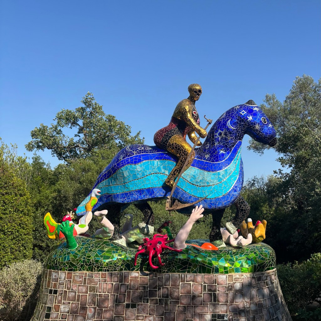Aujourd’hui, on atteint le but officiel du voyage: le Jardin des Tarots de Niki de Saint Phalle. Le désir de ce parc de sculptures monumentales lui est venu grâce au Parc Güell de Gaudí à Barcelone. Le résultat est spectaculaire, fantastique, merveilleux. Les 22 arcanes majeurs du tarot sont représentés, plus quelques sculptures supplémentaires. Hypnotisée devant la Mort, j’ai sorti le tarot de Marseille de mon sac. J’ai battu le jeu, tiré une carte. C’était la Mort.
