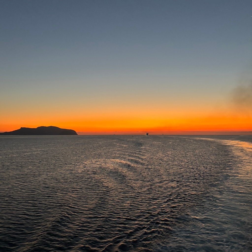 Le soleil s’est levé sur la mer, rose puis orange. C’est la voix du haut-parleur qui m’a réveillée, après 4 heures de sommeil ininterrompu. Ce n’est pas pour faire le téléachat, mais je dois préciser que pour une fois, j’ai pensé à porter mon masque en soie. Tête de princesse au rabais qui dort sur une banquette, mais joie! Un œil ouvert, puis deux. Par une ouverture entre les rideaux, j’ai vu l’aube poindre. J’ai laissé ma Céleste endormie sur le canapé pour aller sur le pont voir le ciel.