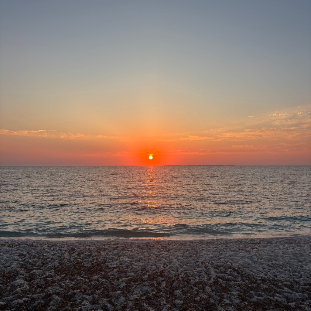 On se presse car le coucher de soleil n’attend personne. Le van serpente entre les collines et le long de la mer, jusqu’à une plaine, au milieu de l’île. C’est désertique, par rapport aux côtes de la Méditerranée qu’on a l’habitude de fréquenter. On voit des nuraghi au loin: de petites tours tronquées datant de l’ère préhistorique. C’est mystérieux et mignon. Enfin on atteint la plage d’Is Arutas, dont le sable est en quartz blanc, et l’eau plus transparente que je n’en ai jamais vu auparavant. C’est magique.